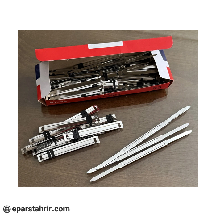گیره پوشه فلزی برند “اطلس” است. این بسته شامل 50 عدد گیره پوشه با طول 80 میلی متر (2 اینچ) میباشد. این گیره ها از جنس فلز با پوشش روی ساخته شده اند که مقاومت بالایی دارند و برای اتصال یا نگه داشتن مجموعه ای از کاغذها و اسناد در پوشه ها استفاده میشوند.