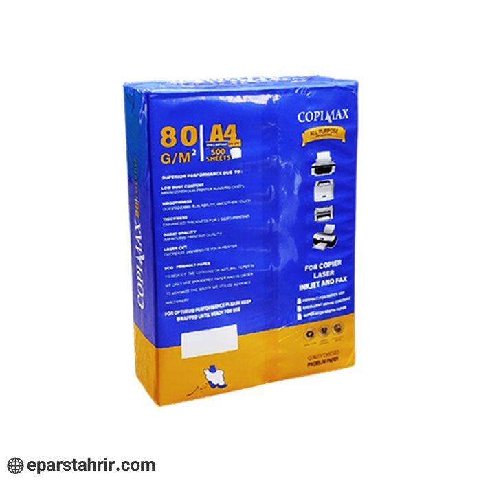 کاغذکپی مکس ۸۰ گرمی -کاغذ از مهمترین محصولاتی است که بیشترین کاربرد را در مدارس، دانشگاه ها، ادارات و نیز منازل دارد – داشتن یک کاغذ مناسب برای کپی، پرینت، فکس بسیار مورد توجه همه قرار دارد، که کیفیت بالا و همچنین قیمت مناسب کاغذ کپی مکس موجب گردیده که محصولات این برند جزو پرفروش ترین کاغذها باشد. – کاغذ کپی مکس COPIMAX یکی از پراستفاده ترین و نیز پرفروش ترین کاغذهای موجود در بازار ایران است. این کاغذ از الیاف سلولزی ساخته شده که به صورت برگه های سفید کاغذی درآمده است و سپس به وسیله برش لیزری در سایزهای مختلف A4 و A3 و A5 و نیز در وزن 80 گرم واقعی تولید میشود، طول هر کدام از برگه های کاغذ A4 کپی مکس، 29.7 سانتی متر و عرض آنها 21 سانتی متر است، که طول و عرض استاندارد یک کاغذ A4 می باشد؛ کاغذهای کپی مکس در بسته بندی 500 عددی و 5 بسته در هر کارتن و در دو رنگ بسته بندی آبی و قهوه ای ، در بازار عرضه می گردد. -کاغذ کپی مکس مناسب برای پرینترهای لیزری، جوهر افشان، دستگاههای فتوکپی و فکس ها مناسب می باشد و نیز جهت فروش در بازار ماشین های اداری و لوازم جانبی می باشد. کاغذ های کپی مکس مورد علاقه افرادی است که با پرینترها زیاد سروکار دارند؛ به این دلیل که کیفیت بالای این کاغذ باعث جلوگیری از پاره شدن و چروک شدگی کاغذ در دستگاه کپی و آسیب زدن به پرینتر و دستگاه کپی می شود. کاغذ کپی مکس از سه کشور مطرح دنیا اندونزی، پرتغال، چین وارد ایران میشود و نیز در تهران و اصفهان و شیراز در سایزهای مختلف برش میخورند و بسته بندی میشوند و به تمام شهرهای کشور عرضه می گردند.